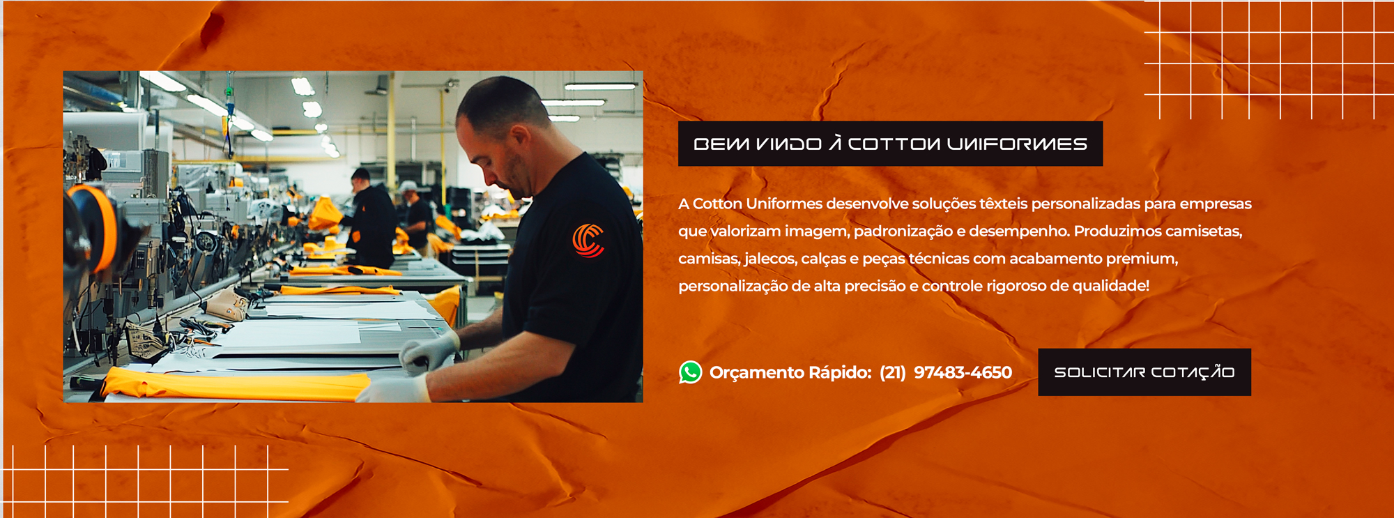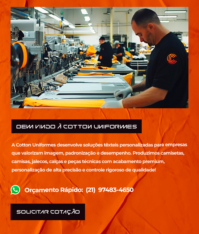 A Cotton Uniformes é especializada no desenvolvimento e produção de uniformes profissionais e camisetas personalizadas, unindo qualidade têxtil, tecnologia de estamparia e acabamento premium. Atendemos empresas de diversos segmentos com soluções completas em vestuário corporativo, garantindo padronização, conforto e durabilidade em cada peça.